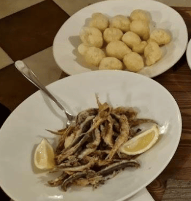 Calamari al sugo, alici marinate avvolte in mollica di pane speziato e l’immancabile zuppa di fagioli leggermente piccante.